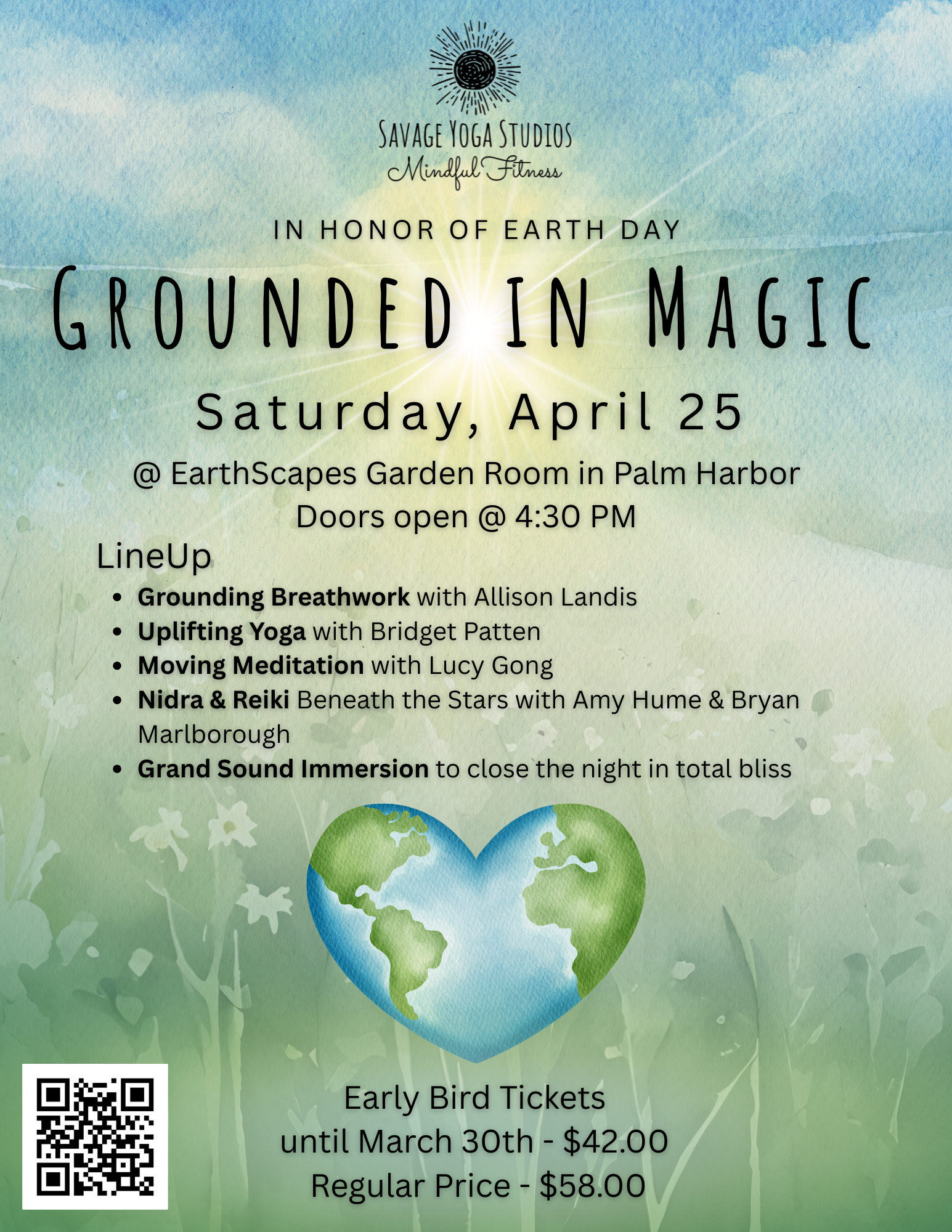 Doors open at 4:30pm LineUp ✨ Grounding Breathwork with Allison Landis ✨ Uplifting Yoga with Bridget Patten ✨ Moving Meditation with Lucy Gong ✨ Nidra & Reiki Beneath the Stars with Amy Hume & Bryan Marlborough ✨ Grand Sound Immersion to close the night in total bliss Early Bird Tickets until 3/30 $42.00 Regular Price $58.00